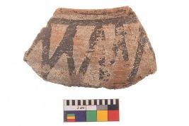 | Description / विवरण | Specimen of black on red ware with black decorative Joint triangles geometric painting. |