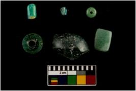 | Description / विवरण | There are n-6 of beads. Out of them 1 is short cylindrical with one convex end, 2 are short cylindrical, 1 is pear shape disc and 1 is standard barrel green beads made up of Glass. Out of them 5 are in intact condition and 1 is broken. |