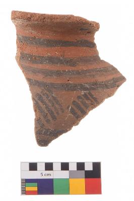 | Description / विवरण | Specimen of black on red ware with black decorative Cheques pattern with parallel lines geometric painting. |