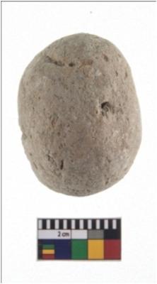 | Description / विवरण | A complete specimen of sandstone slingball with roughly circular shape with a battered periphery along with the circumference. It is having smooth surface. It is whitish in colour. |