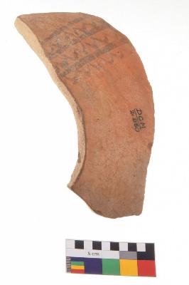 | Description / विवरण | Specimen of black on red ware with black decorative Parallel wavy and straight lines geometric painting. |