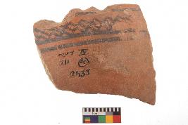 | Description / विवरण | Specimen of black on red ware with black decorative Lattice pattern on rim geometric painting. |
