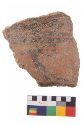 | Description / विवरण | Specimen of black on red ware with black decorative Lattice pattern on rim and animal motif on body nature and geometric painting. |