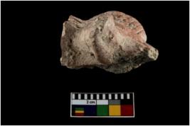 | Description / विवरण | A broken figurine with some line marks on three sides and pinched in the middle, Red in colour. |