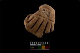 | Description / विवरण | A broken figurine with headgear like feature on top and pinched at the center , Red in colour. |