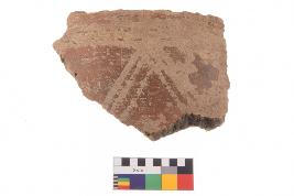 | Description / विवरण | Specimen of black on red ware with black decorative Triangle and parallel lines geometric painting. |