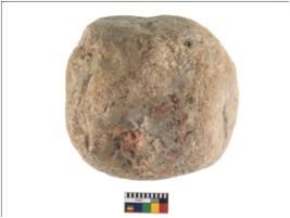 | Description / विवरण | A partially broken specimen of roughly round shaped hammerstone piece with reddish tint and battered periphery. It is almost broken from middle portion. It is made up of quartz. |