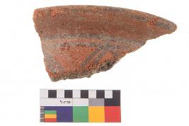 | Description / विवरण | Specimen of black on red ware with black decorative Joint triangles geometric painting. |