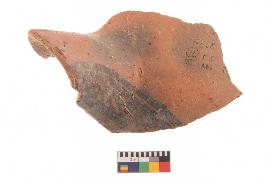 | Description / विवरण | Specimen of black on red ware with black decorative Lattice pattern geometric painting. |