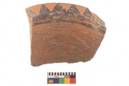 | Description / विवरण | Specimen of black on red ware with black decorative Joint triangles geometric painting. |