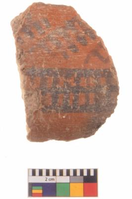 | Description / विवरण | Specimen of black on red ware with black decorative Cross spike lines and lattice pattern geometric painting. |