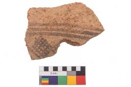 | Description / विवरण | Specimen of black on red ware with black decorative Joint lattice squares geometric painting. |