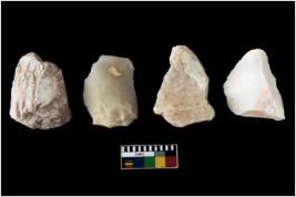 | Description / विवरण | There are n-4 of intact utilized flake cores made up of Chert. Some of them have bulge of percussion, some are flat flakes and few are retouched. |