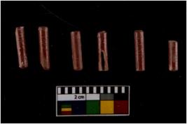 | Description / विवरण | This is a set of n 6 tubular beads. They are made of red paste and some are glazed. Some are plain. Very thin in size. |