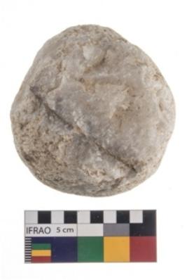 | Description / विवरण | A complete specimen of a hammer stone, with rough surface It is made of quartz it is roughly circular in shape, it is with battering marks. |