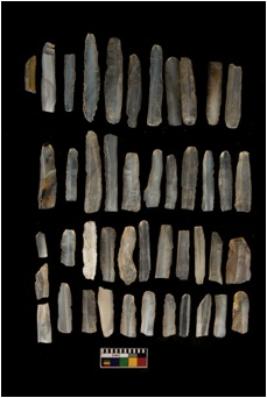 | Description / विवरण | There are 45 microlithic blades and broken fragments in all. All of them show signs of retouching. All of them are made of chalcedony |