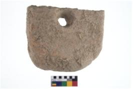 | Description / विवरण | A partially broken specimen of mace head it is made of quartzite, roughly oval shaped with rounded edges perforation in the centre. |