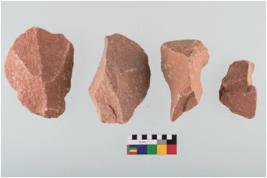 | Description / विवरण | Specimen of flake tools with prominent flaking marks. Made up of a short flakes with sides trimmed. |