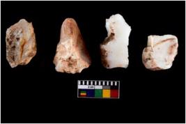 | Description / विवरण | Four worked utilised cores from which blades removed from almost all the sides. |
