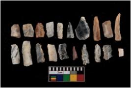 | Description / विवरण | There are n 20 objects of which 13 are quartz and 7 are chert. Out of these, 11 appear as bladelets and the rest debitages, a few of which can also be characterized as points. The blades are in poor working condition and have lost sharpness. There are single to double flake scars on their surface with no retouchings. The edges appear blunt but do not show any signs of damage. |