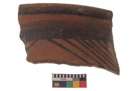 | Description / विवरण | Specimen of potsherd with decorative geometric Linear Pattern painting, Type Black on Red Ware . |