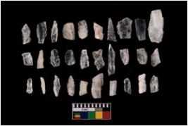 | Description / विवरण | There are n 30 objects of which 28 are quartz and 2 are chalcedony, out of which 19 can be characterized as blades, the rest as debitages. The Blades have single to double flake scars von their surface. The edges have small retouchings and appear a bit blunt. There are signs of litlle damage along the surface and on the edges. |