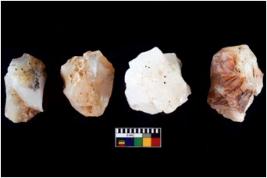 | Description / विवरण | Four worked utilised cores from which blades removed from almost all the sides. |