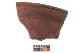 | Description / विवरण | Specimen of potsherd with decorative geometric Diamond set broad horizontal bands painting, Type Black on Red Ware . |