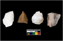 | Description / विवरण | There are n 4 objects. Out of that two are made of Quartz and two out of chert. One of the chert core is flaked out in giving the core a conical shape with pointed tip. |