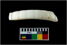| Description / विवरण | A broken fragment of a decorated shell bangle. It is creamish in colour with rectangular cross section. |