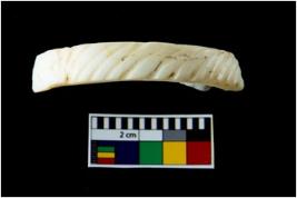 | Description / विवरण | A broken fragment of a decorated shell bangle. It is creamish in colour with rectangular cross section. |