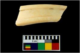 | Description / विवरण | A broken fragment of a decorated shell bangle. It is creamish in colour with rectangular cross section. |