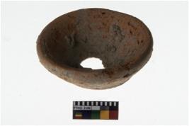 | Description / विवरण | A partially broken specimen of a small red ware terracotta lamp, with featureless round rim and small circular base containing circular grooves. It is made of medium fabric and it is medium fired. bottom portion has been broken and having hole on it. |