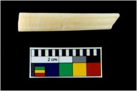 | Description / विवरण | A broken fragment of a decorated shell bangle. It is creamish in colour with rectangular cross section. |