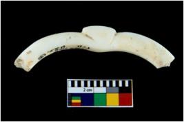 | Description / विवरण | A broken fragment of a decorated shell bangle. It is creamish in colour with rectangular cross section. |