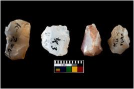 | Description / विवरण | Four worked utilised cores from which blades removed from almost all the sides. |