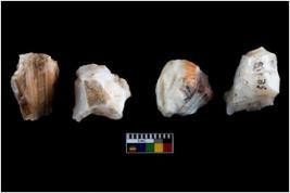 | Description / विवरण | Four utilised worked cores with sharp edges. Some of them are tapering at one end. Removal of flakes from few sides. |
