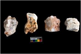 | Description / विवरण | Four utilised worked cores with sharp edges. Some of them are tapering at one end. Removal of flakes from few sides. |