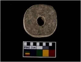 | Description / विवरण | A complete specimen of grey ware oblong shaped terracotta disc with perforation. Inner diameter is of 5.41mm. |