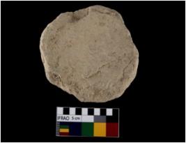 | Description / विवरण | A partially broken specimen of stone disc with rough surface and flaked edge. It is made of sandstone. |