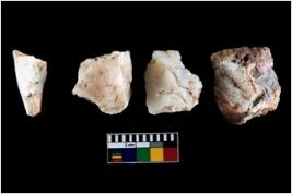 | Description / विवरण | Four utilised worked cores with sharp edges. Some of them are tapering at one end. Removal of flakes from few sides. |