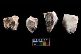 | Description / विवरण | Four utilised worked cores with sharp edges. Some of them are tapering at one end. Removal of flakes from few sides. |