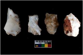 | Description / विवरण | Four utilised worked cores with sharp edges. Some of them are tapering at one end. Removal of flakes from few sides. |