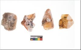 | Description / विवरण | Four utilised worked cores with sharp edges. Flakes removed from almost all the sides. Some are tapering at one end. |