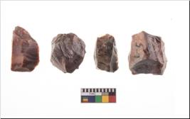 | Description / विवरण | Four utilised worked cores with sharp edges. Flakes removed from almost all the sides. Some are tapering at one end. |