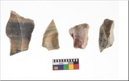 | Description / विवरण | Four utilised worked cores with sharp edges. Flakes removed from almost all the sides. Some are tapering at one end. |