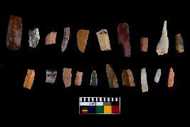 | Description / विवरण | There are n-20 of microliths, among them 3 are quartz, and 17 are of chert. Some of them are partially broken. They show variation in colour, size and shape. Some of them are blunted back blades, points, triangles, trapezes, crescent and truncated blades. |