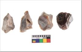 | Description / विवरण | Four utilised worked cores with sharp edges. Flakes removed from almost all the sides. Some are tapering at one end. |