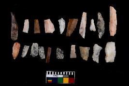| Description / विवरण | There are n-20 of microliths, among them 6 are quartz, and 14 are of chert. Some of them are partially broken. They show variation in colour, size and shape. Some of them are blunted back blades, points, triangles, trapezes, crescent and truncated blades. |