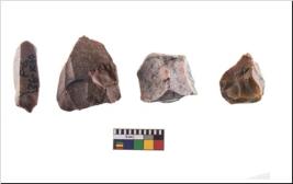 | Description / विवरण | Four utilised worked cores with sharp edges. Flakes removed from almost all the sides. Some are tapering at one end. |